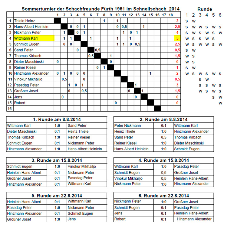 Noch nachzutragen ist das Endergebnis des Sommerturniers, das im August bei den Schachfreunden stattfand. In sechs Runden Schnellschach sicherte sich Karl Wittmann den ersten Platz, dicht gefolgt von Peter Nickmann und Peter Pasedag.