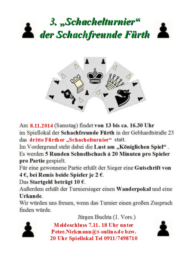 Am Samstag, den 8.11. findet im Spiellokal der Fürther Schachfreunde das 3. Schachelturnier statt.
