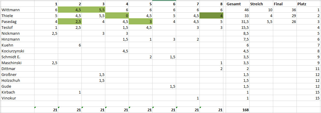 Mit dem Weihnachtsturnier endete der Turnierzyklus zur Ermittlung des Blitzmeisters 2014. Souveräner Sieger mit 36 Wertungspunkten wurde Karl Wittmann. Der zweite Platz ging an Heinz Thiele, Dritter wurde Peter Pasedag.