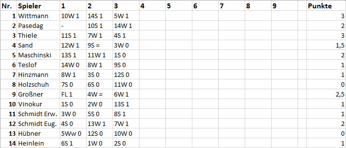 Am Freitag, den 08.01.2016 begann das Winterturnier. Die ersten drei Runden wurden von Heinz und Karl mit weißer Weste überstanden, so dass die Beiden die Tabellenspitze bilden, dicht gefolgt von Josef Großner.