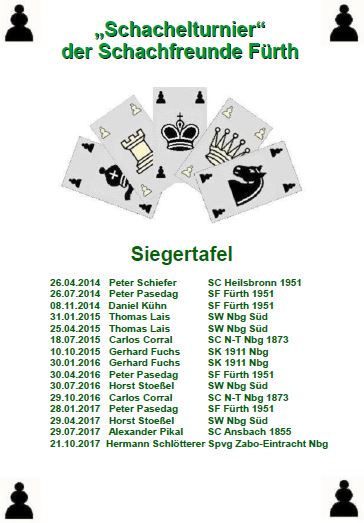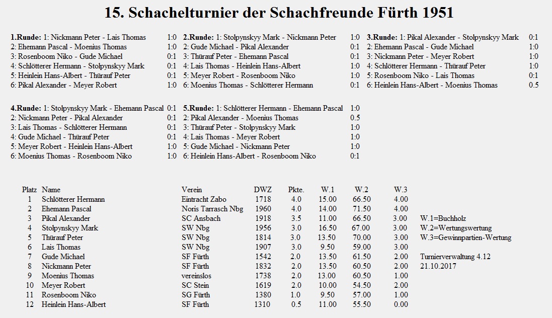 Sieger beim 15. Schachelturnier wurde Hermann Schlötterer von Eintracht Zabo Nürnberg. Ihm folgten Pascal Ehemann (SC NT Nürnberg) und Alexander Pikal (SC Ansbach).